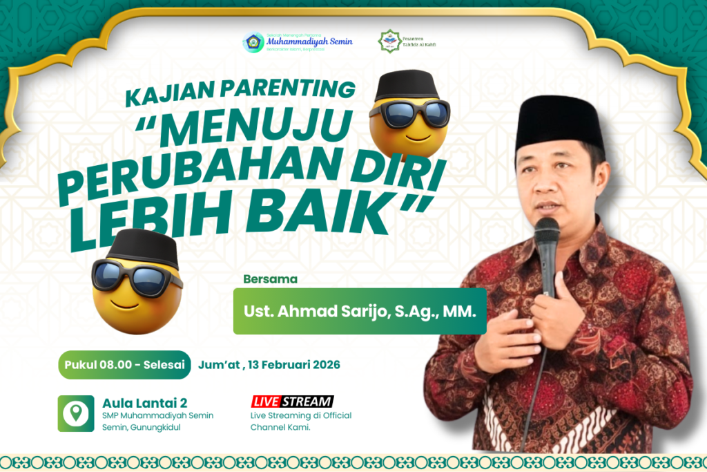 SMP Muhammadiyah Semin kembali menyelenggarakan kegiatan edukatif bagi siswa dan orang tua melalui program Kajian Parenting Kelas IX. Kegiatan ini dilaksanakan pada Jumat, 13 Februari 2026 bertempat di Aula Lantai 2 SMP Muhammadiyah Semin. Kegiatan ini menghadirkan narasumber inspiratif, yaitu Ust. Ahmad Sarijo, dengan mengangkat tema “Menuju Perubahan Lebih Baik.” Kajian parenting ini diikuti oleh […]